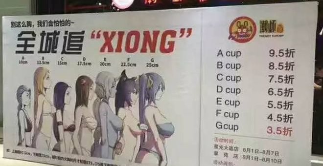 Σύμφωνα με την εφημερίδα Qianjiang Evening Post, πολίτες έκαναν παράπονα στις τοπικές αρχές, μετά την ανάρτηση αφισών που διαφημίζουν τις εκπτώσεις στο εστιατόριο Trendy Shrimp («Μοδάτη – τρέντι» Γαρίδα) που λειτουργεί σε ένα εμπορικό κέντρο στην πόλη Χανγκζού, πρωτεύουσα της επαρχίας Ζετζιάνγκ.