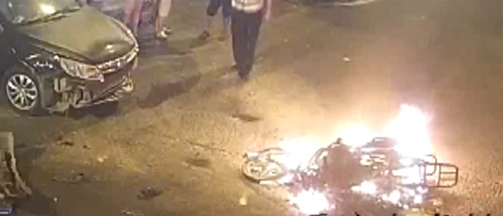 Οι τέσσερις επιβαίνοντες της μοτοσικλέτας έπεσαν στο δρόμο και τραυματίστηκαν, λίγο προτού η μηχανή περάσει το αυτοκίνητο και πάρει φωτιά.