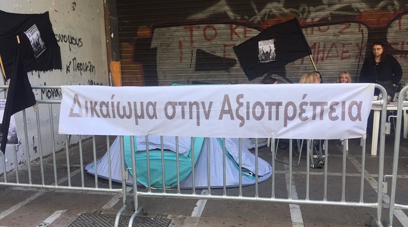 Γυναίκες και άντρες που έχουν χάσει τους συζύγους τους έχουν κατασκηνώσει από τη Δευτέρα στην είσοδο του υπουργείου όπου και θα παραμείνουν μέχρι την Παρασκευή οπότε θα συναντηθούν με την Έφη Αχτσιόγλου.