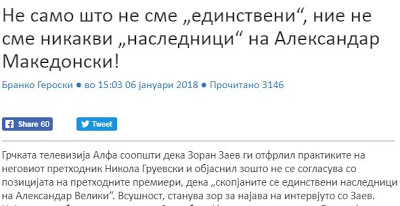 Γκρούεφσκι και εξήγησε γιατί δεν συμφωνεί με τη θέση του προηγούμενου πρωθυπουργού ότι «τα Σκόπια είναι οι μόνοι απόγονοι του Μεγάλου Αλεξάνδρου», γράφει ο αρχισυντάκτης της ηλεκτρονικής πύλης «Plus Info», Μπράνκο Γκερόσκι (Бранко Героски ) και της εφημερίδας «Ελεύθερος Τύπος» (Σλόμποντεν Πέτσατ).