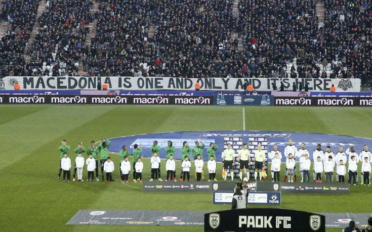 Οι υποστηρικτές του «δικεφάλου» του Βορρά κρέμασαν στις εξέδρες της Τούμπας ένα μεγάλο πανό με το μήνυμα «Macedonia is one and only and it’ s here», δηλαδή «Η Μακεδονία είναι μία και μοναδική και βρίσκεται εδώ».