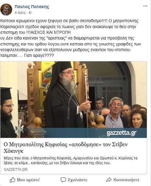 Μύδρους κατά του μητροπολίτη Κηφισιάς, Αμαρουσία και Ωρωπού Κυρίλου εξαπέλυσε ο αναπληρωτής υπουργός Υγείας Παύλος Πολάκης με αφορμή την ποιμαντορική εγκύκλιο του ιερωμένου για το Πάσχα και τις αναφορές του στον Στίβεν Χόκινγκ.