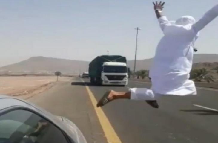 Ένας Σαουδάραβας είχε όρεξη για πλάκα και για… να παίξει την ζωή του κορώνα – γράμματα. Τι έκανε; Αποφάσισε να «πηδήξει» από ένα αυτοκίνητο στη μέση του δρόμου και να αποφύγει κυριολεκτικά στο παρά πέντε μια διερχόμενη νταλίκα.