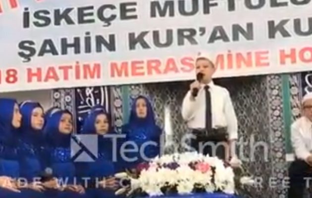 Μικρά παιδιά σε σχολική γιορτή απαγγέλλουν εθνικιστικό ποίημα με προκλητικά τουρκικά οθωμανικά μηνύματα.