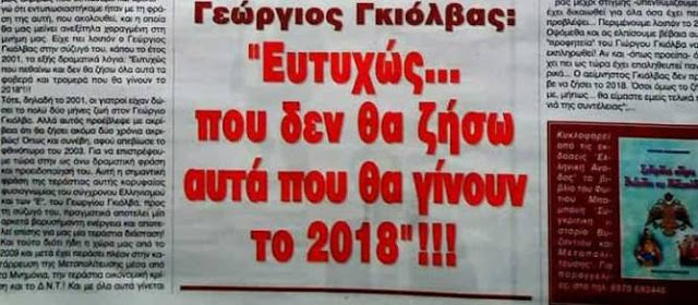 Ο μεγάλος πανεπιστήμων Γεώργιος Γκιόλβας, είχε πει στην σύζυγό του, κάπου το έτος 2001, 2 χρόνια πριν τον θάνατο του δηλαδή, τα εξής δραματικά λόγια: «Ευτυχώς που πεθαίνω και δεν θα ζήσω όλα αυτά τα φοβερά και τρομερά που θα γίνουν το 2018»!!!