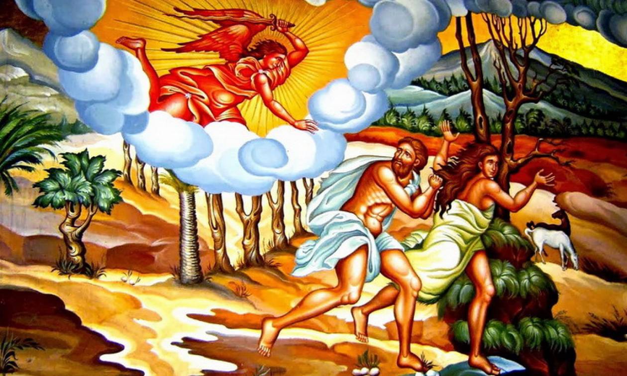 Η αγία Γραφή αναφέρει συμβολικά πως οι πρωτόπλαστοι διώχτηκαν από τον κήπο της Εδέμ και δύο αγγελικά όντα τάχθηκαν να φυλάγουν με πύρινες ρομφαίες την πύλη του, για να μην μπορούν να την παραβιάσουν αυτοί.
