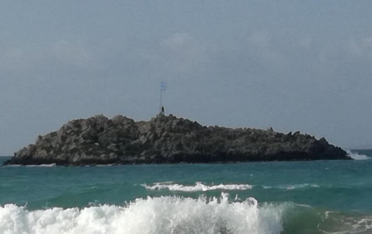Ο Γιάννης Μπούγιας, κολύμπησε από την παραλία μέχρι το νησάκι και στη θέση της σκισμένης σημαίας, έβαλε μια καινούρια. Στη συνέχεια ανέβασε τις σχετικές εικόνες στο διαδίκτυο…