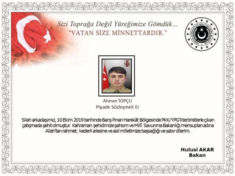 Πρόκειται για τον Αχμέτ Τοπτσού. Όπως ανακοίνωσε το τουρκικό υπουργείο Άμυνας: «Ο συμπολεμιστής μας στις 10 Οκτωβρίου 2019 έγινε μάρτυρας κατά την επιχείρηση “Πηγή Ειρήνης”κατά των τρομοκρατών του PKK. Εγώ προσωπικά (σ.σ. ο υπουργός Άμυνας Χουλουσί Ακάρ) και τα μέλη του υπουργείου Άμυνας ευχόμαστε ο Θεός να συγχωρέσει τον ήρωα. Εκφράζω τα συλλυπητήρια μου στην οικογένεια του».