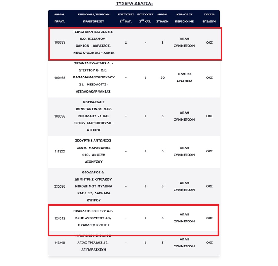 Την ίδια ώρα, ένα από τα έξι τυχερά πεντάρια το οποίο κερδίζει το ποσό των €100.000,00 "'έπεσε" στο Ηράκλειο και ειδικότερα σε πρακτορείο ΟΠΑΠ επί της 25ης Αυγούστου, στο κέντρο της πόλης.